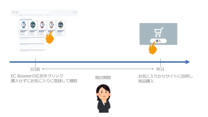 結論から言うと、ズレが発生している原因は、購入を行ったユーザーが3日前にEC Boosterの広告をクリックしたもののそのタイミングでは商品を買わず、検討を重ねた結果昨日購入を行ったからです。